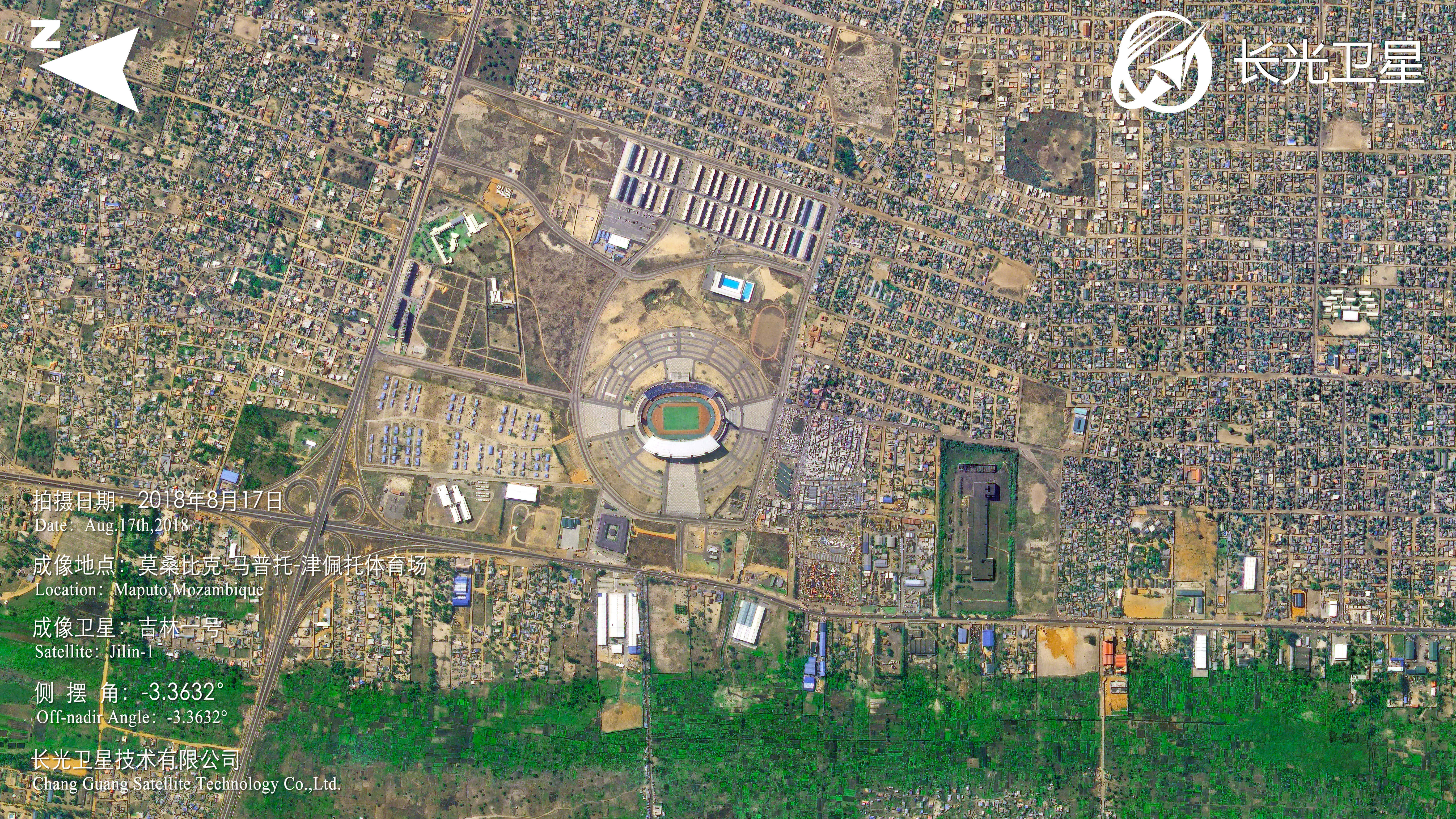 津佩托体育场占地面积近27万平方米,共有4.2万个座位,是莫桑比克独立30多年来建成的最大、最现代化的综合性体育基础设施。从“吉林一号”拍摄的图上看,津佩托体育场像一枚十字带花的勋章坐落在马普托市北郊。