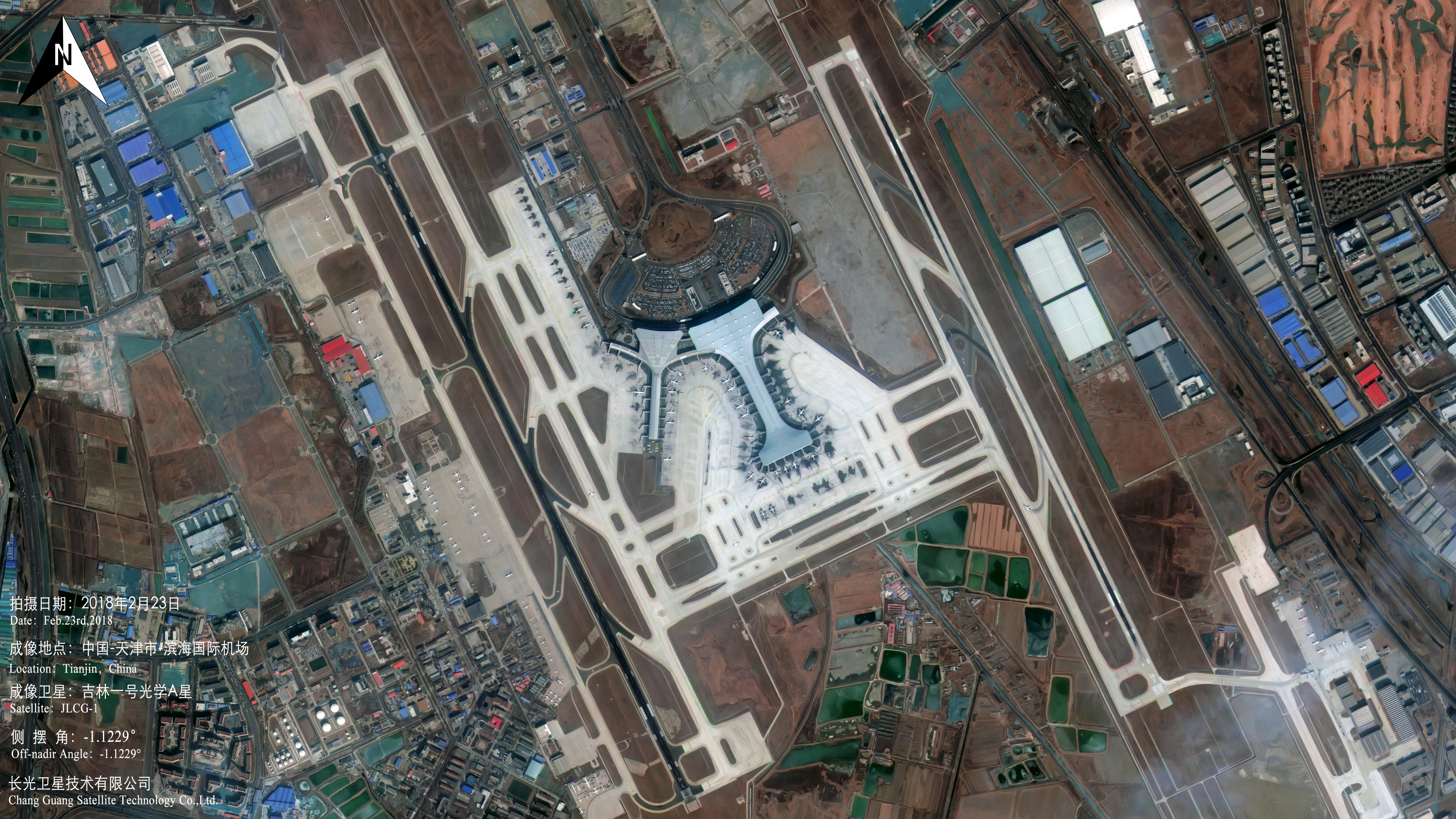 天津滨海国际机场位于天津市东丽区,为4F级民用国际机场,是国际定期航班机场、对外开放的国家一类航空口岸和中国主要的航空货运中心之一。在“吉林一号”拍摄到的卫星图可以看到,T1航站楼楼体外部为淡绿色玻璃幕墙。T2航站楼位于T1航站楼的东侧,于2014年8月正式启用,总建筑面积24.8万平方米。