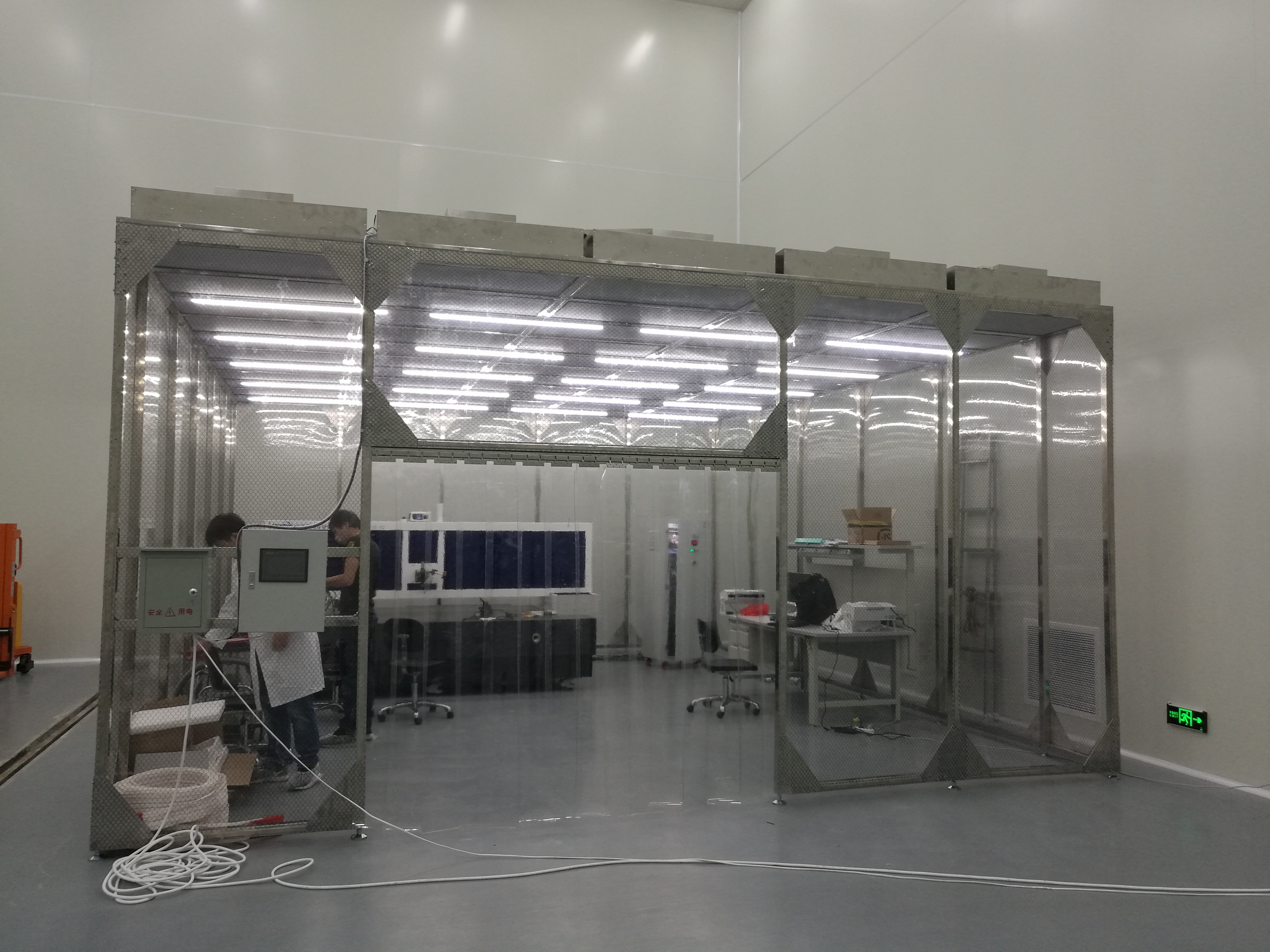 洁净棚是一种可提供局部高洁净环境的空气净化设备。主要由箱体、风机、初效空气过滤器、阻尼层、灯具等组成。采用工业铝材作为框架,风机滤网机组(FFU)送风,四周悬挂防静电垂帘,我公司采购的洁净棚其内部净化级别可达到百级。