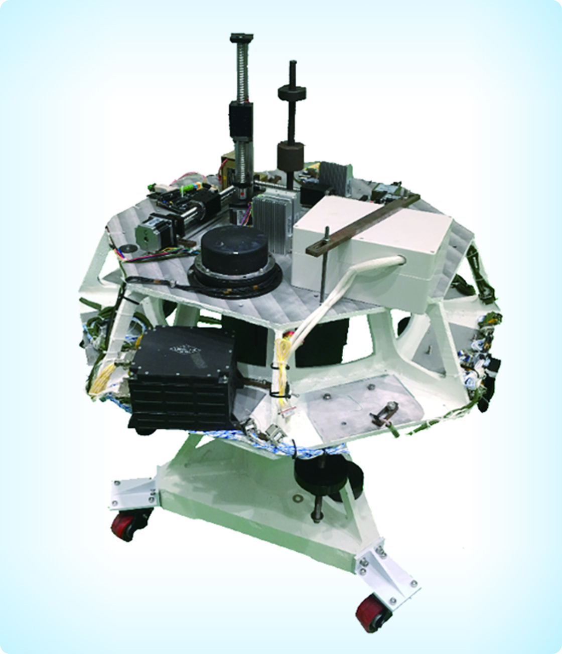 高精度卫星姿态控制仿真系统由公司自主研制的三轴精密气浮转台、星上姿控部件、星上中心机系统、星上电源系统、星上测控系统等组成,三轴气浮转台采用了目前较为先进的“伞形”双层结构,该系统用来进行小卫星姿态机动及稳定控制算法及逻辑的仿真验证。