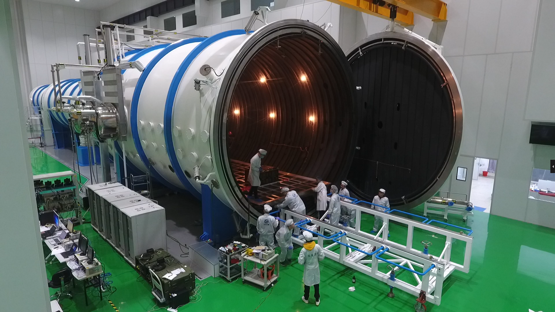 设备用于模拟太空的高真空和冷黑环境,可以进行载荷的热真空、热平衡及热光学等空间环境模拟试验。