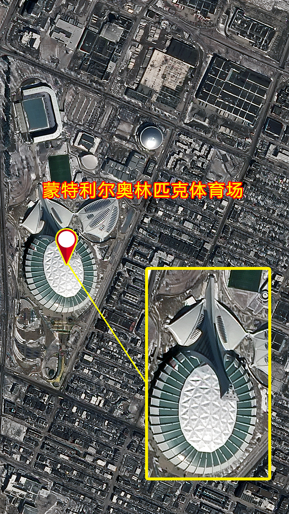 从卫星影像看蒙特利尔奥林匹克体育场,就像一艘扬帆的巨轮静卧在蒙特利尔岛东部。白色的体育场造型奇特,其斜塔是世界上最高的倾斜式人工建筑,高达 175 米,比美国华盛顿的华盛顿纪念碑还要高。从斜塔底部到塔顶,倾斜的角度也逐渐加大,从 23°一直增加到 63.4° 。体育场设有213米高的鹰咀式高塔,塔顶悬挂覆盖整个体育场的顶棚,电钮一开,整个由钢索悬挂的顶棚便可使体育场变成前所未有的室内运动场。