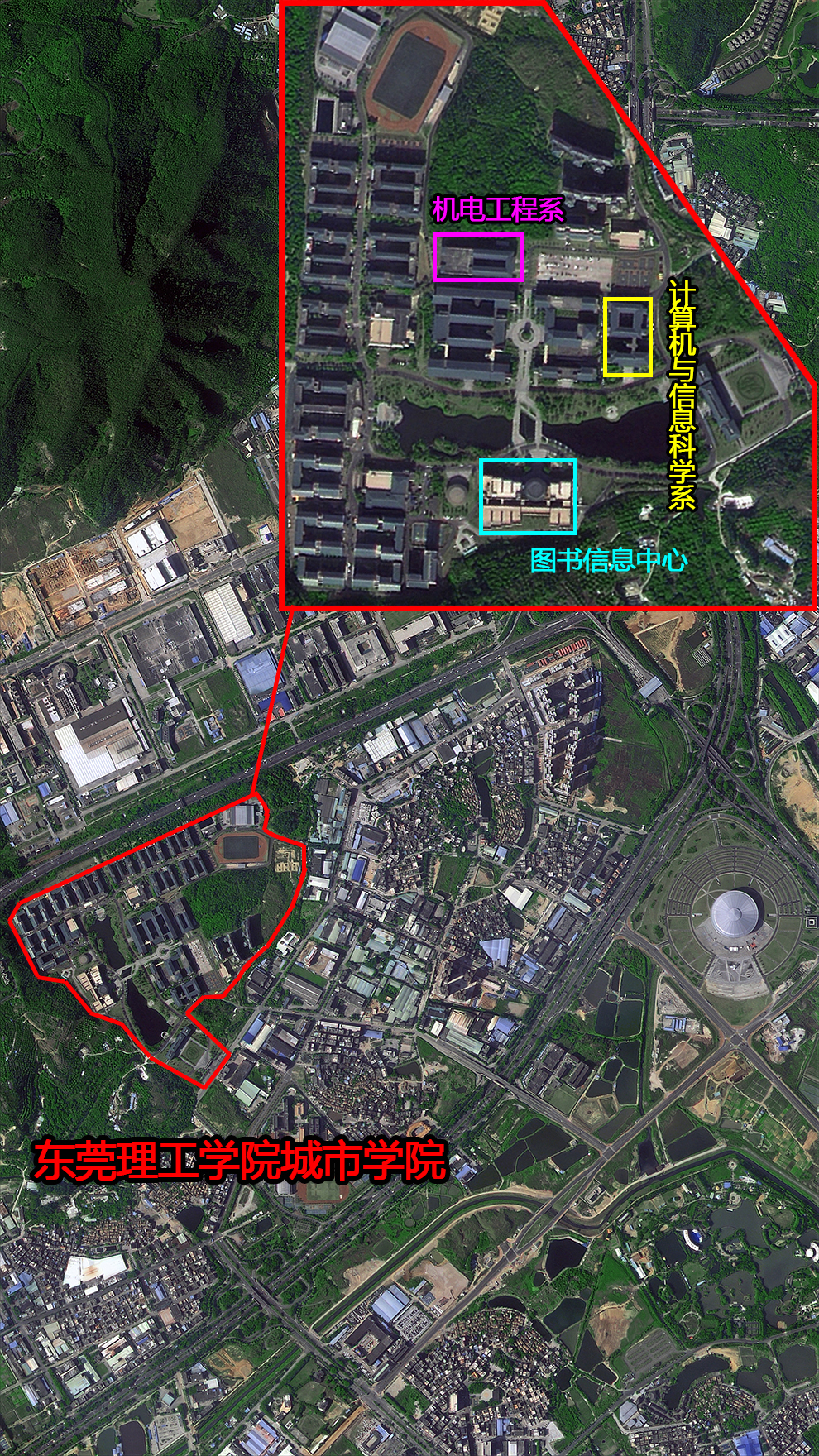 东莞理工学院城市学院位于东莞市寮步镇松山湖大道旁,建筑面积44万平方米,校园建设依托原有的自然环境风貌,以“山、水、树、人”融一体为设计理念,学院设有机电工程、计算机与信息科学等12个教学系和28个本科专业,还建有馆藏丰富的图书信息中心,是广东省独立学院中拥有省级精品课程和获得教学成果奖的学校。