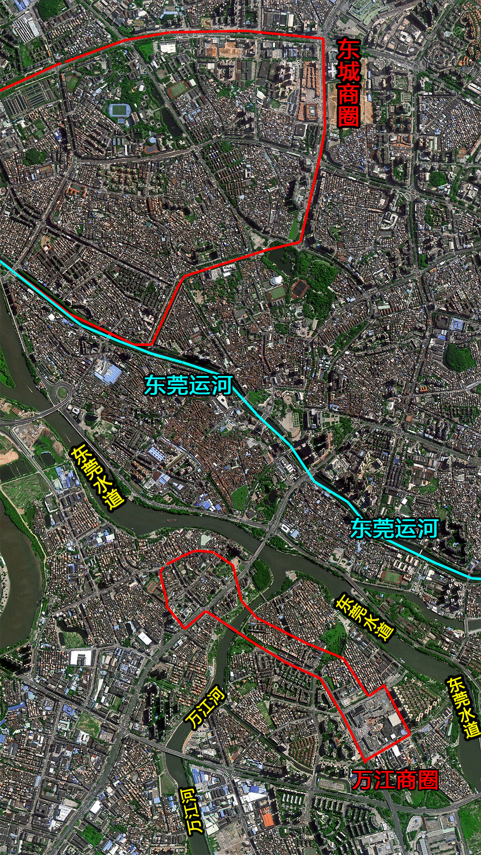 图为东莞市中心莞城区,位于东莞市中北部,城区主要河流有万江河、东莞水道以及万江河。莞城区临近东城商圈与万江商圈,街道内道路纵横交错,交通网络四通八达,成为东莞城镇中最具实力和活力的创业热土、聚富宝地。