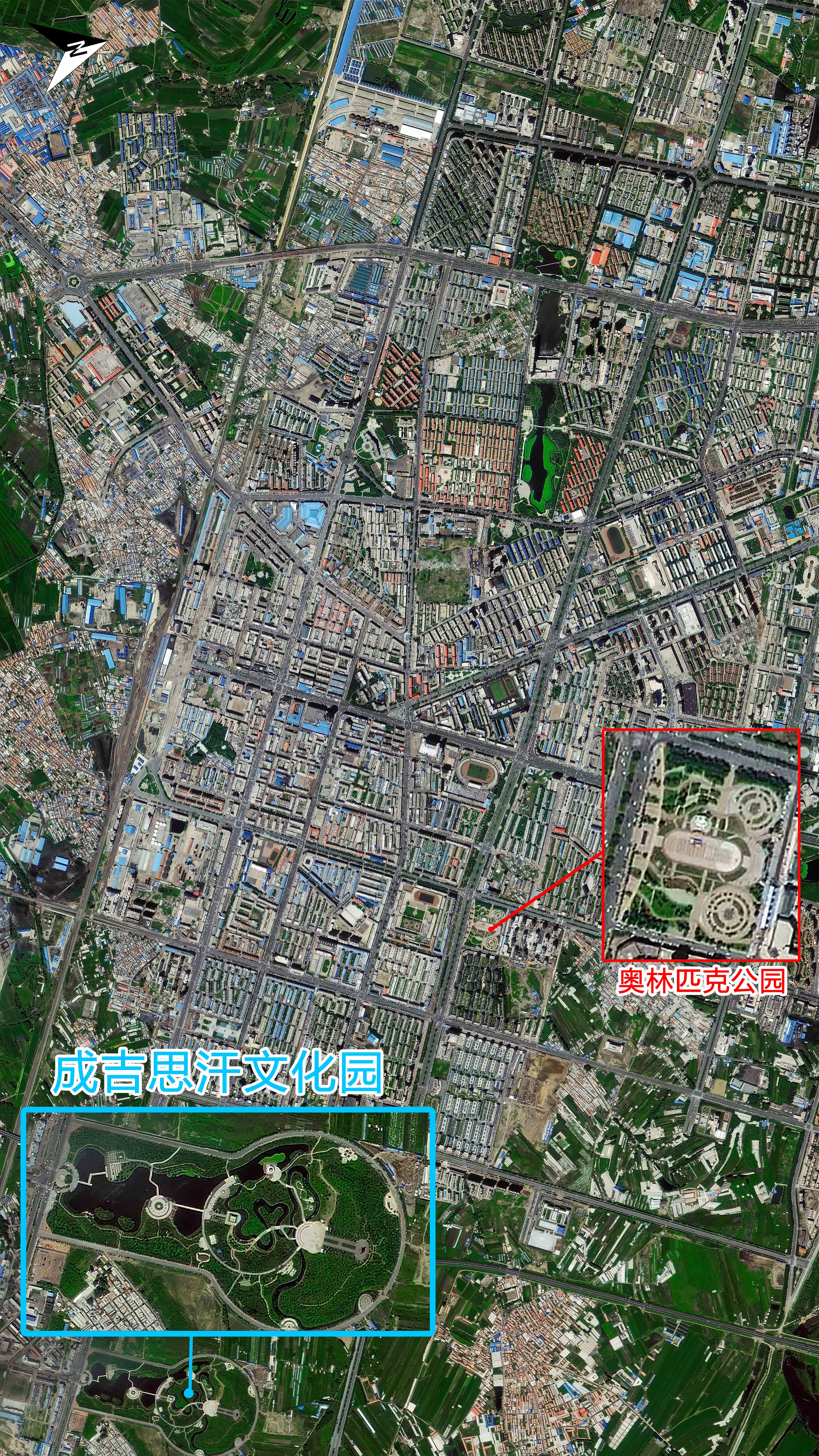 前郭尔罗斯蒙古族自治县位于吉林省西北部,总占地面积7000平方公里,总人口60万人,是吉林省唯一的蒙古族自治县。该地区被中国民族管弦乐学会命名为“中国马头琴之乡”,被文化部命名为“中国民间文化艺术之乡”。“吉林一号”拍摄到了当地的两处特色公园。