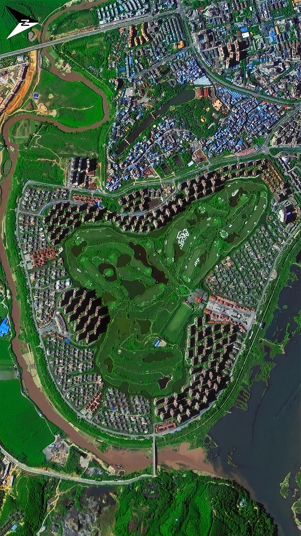 从卫星图中可以看到,西双版纳世纪金源高尔夫球场四周依山傍水,仙境环绕,既保留了自然的地势景貌,更利用天然形成的岩石、人工种植的果林和人工湖泊等作为球道的天然障碍区和球场的景观点缀。