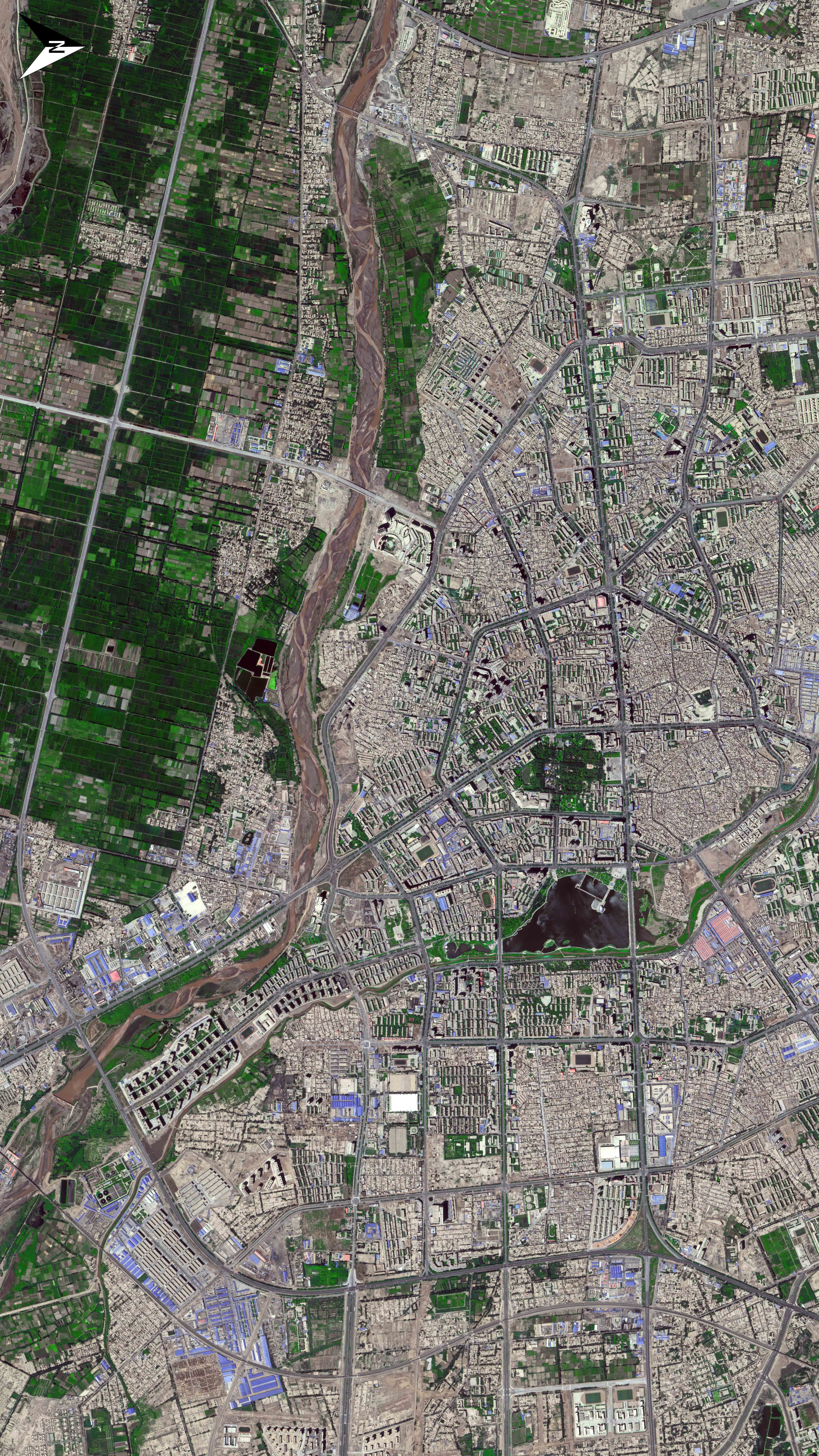 喀什地区位于祖国西陲、新疆维吾尔自治区西南部。“吉林一号”拍摄的卫星图显示的是喀什市区及其周边地区。